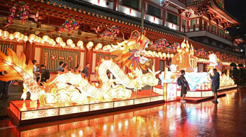 1月21日,游客在豫园商城中心广场赏灯拍照。