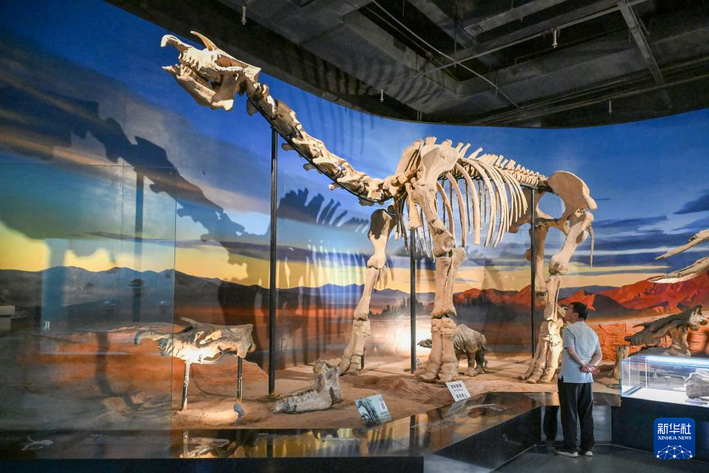 5月14日,游客在吐鲁番博物馆观看巨犀化石。