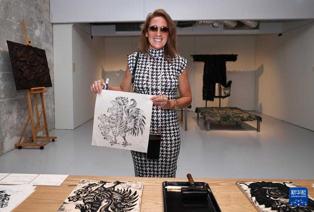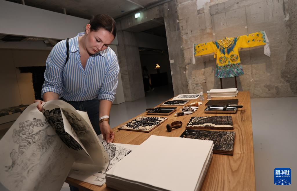 7月6日,观众在法国巴黎装饰艺术博物馆举办的“新生万物-中国非遗与当代设计展”上体验晋江木版年画制作。