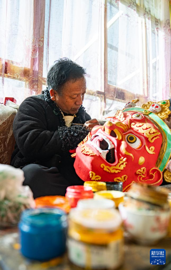 在拉萨市达孜区雪乡民间传统手工艺农民专业合作社的小院里,拉萨布制面具制作技艺西藏自治区级非遗传承人西洛和徒弟们忙得热火朝天,他们正在制作面具。面具制作工序繁杂,制作一个面具包括雕刻、分层、风干和喷漆等十几道工序。
