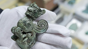 12月16日,三星堆研究院工作人员展示一件青铜文物。