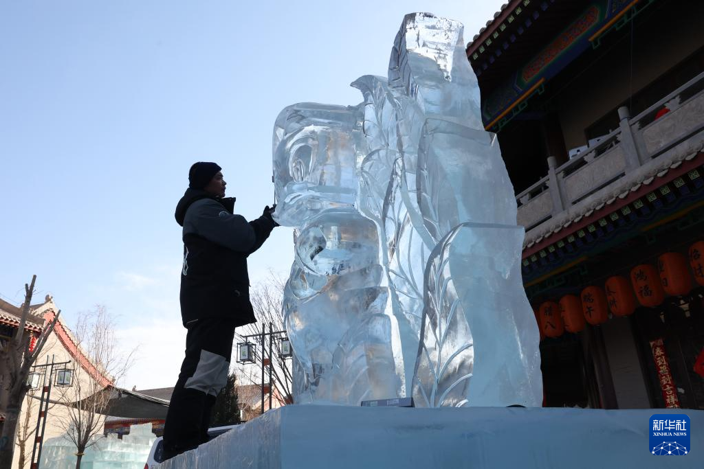 在甘肃省张掖市甘州区甘州府城景区内的冰雕展区,冰雕师赵浩在打磨一组冰雕作品(1月21日摄)。