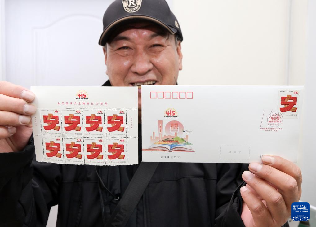 4月15日,邮迷在北京市西城区集邮营业厅展示《全民国家安全教育日10周年》纪念邮票和首日封。