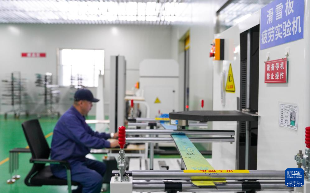 12月4日,在吉林化纤国兴复合材料有限公司的车间内,工作人员用机器设备检测公司自主研发生产的碳纤维滑雪板。新华社记者 颜麟蕴 摄