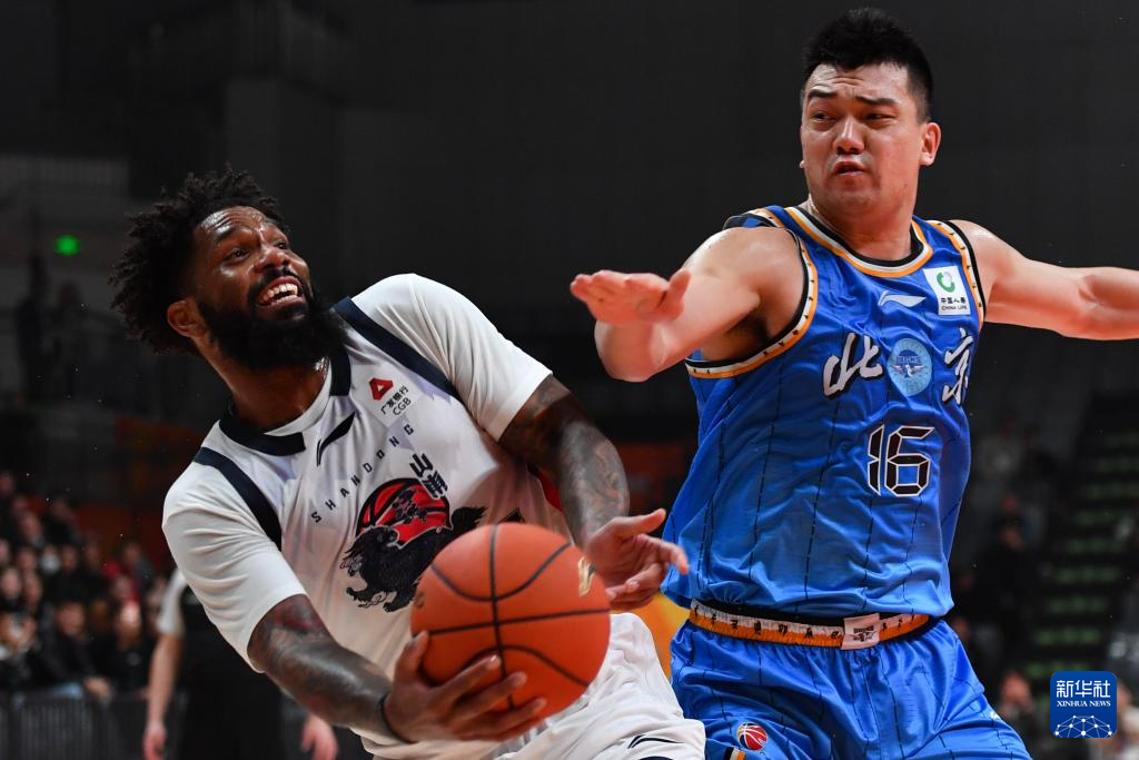 12月7日,北京北汽队球员杰曼(右)在山东高速队球员陶汉林防守下进攻。
