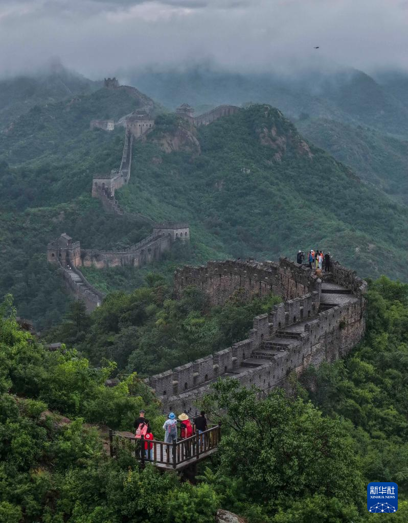 8月20日,游客在河北省承德市滦平县金山岭长城观赏晨景(无人机照片)。