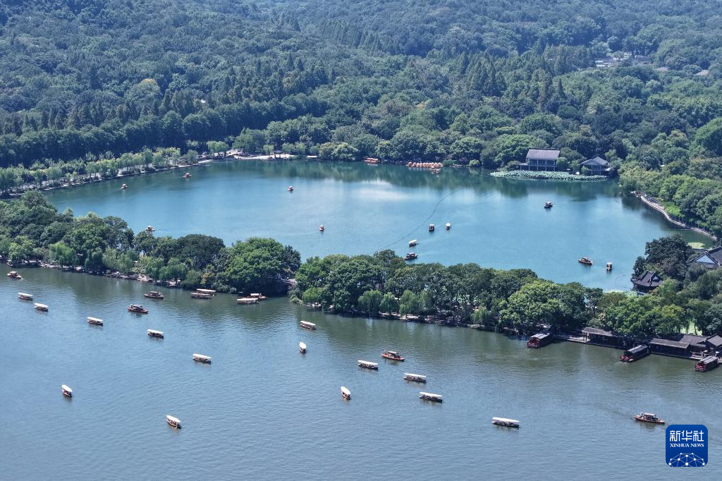 8月24日,游客在浙江省杭州市西湖乘船游玩(无人机照片)。