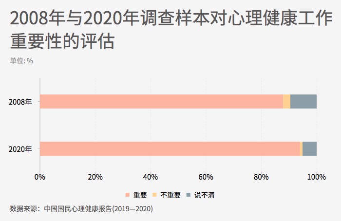 ??? 心理健康意識體現為認識到心理健康工作的重要性。對于心理健康工作重要性的評估,2020年調查中,有94.0%的調查對象認為心理健康工作是重要的。與2008年相比,2020年調查中,有更多的人認為心理健康工作重要,比12年前提高了6.1個百分點,說明人們的心理健康意識有所增強。