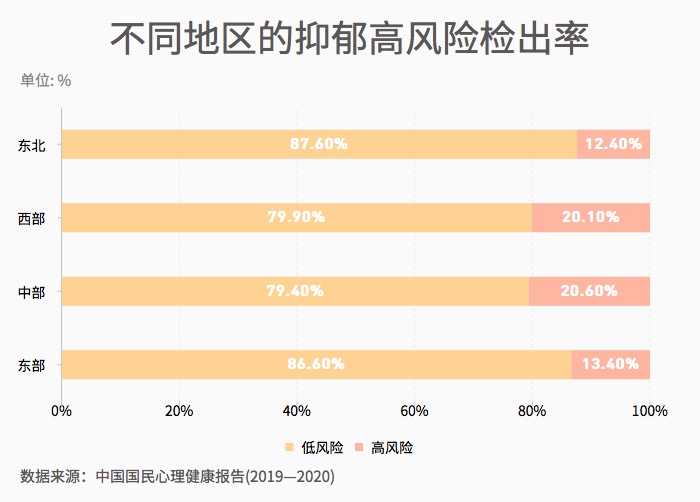 ??? 心理健康狀況受到地區經濟發展、教育水平、醫療條件等諸多宏觀因素的影響,因此通常與這些宏觀因素一樣表現出地區差異。2020年度調查發現,東部地區的總體心理健康水平更好。東部地區與東北地區的抑郁水平顯著低于中部和西部地區,抑郁高風險的檢出率顯著低于中部和西部地區。