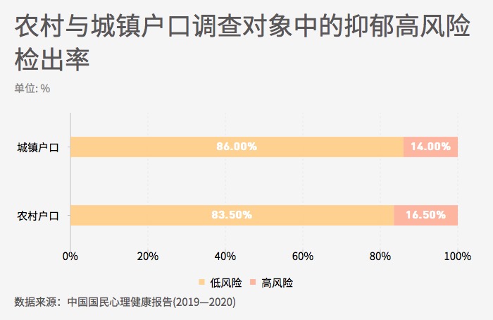 ??? 國內外研究普遍發現,社會經濟地位通常與心理健康水平呈正相關。較高的收入水平、較高的學歷、聲望較好的職業,往往意味著擁有包括心理健康資源在內的各種資源支持,有助于維護更高的心理健康水平。研究也發現,農村戶口人群與城鎮戶口人群之間存在心理健康水平差異。調查中發現農村戶口人群中抑郁高風險的檢出率略高于城鎮戶口人群。