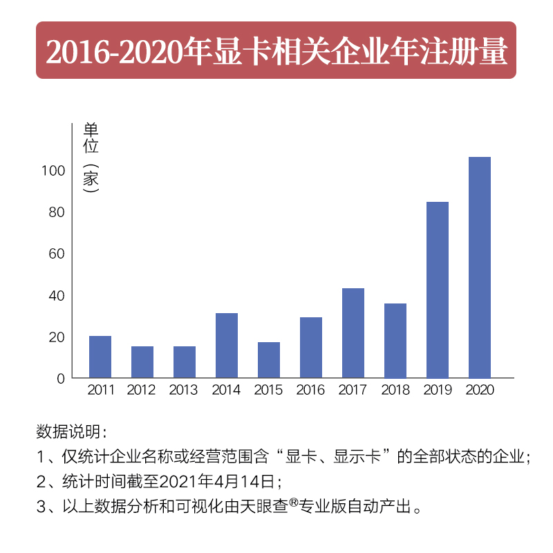 ????? 得益于旺盛的市場需求,以及消費者對顯卡需求的提高,越來越多的企業投入顯卡生產。我國顯卡相關企業(全部企業狀態)新增數量呈現波動上漲趨勢。其中,2019年,新增80余家顯卡相關企業,增速達到17.4%,2020年,新增超過100家,增速高達18.7%,為近十年最高。