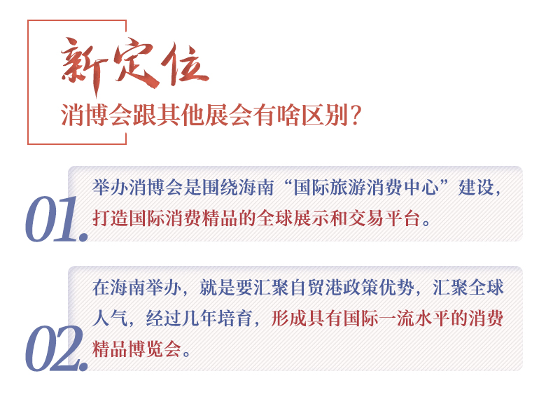 ??? 消博會的舉辦背后,是來自海南自貿港一系列政策紅利的支撐。早在2020年6月1日,由中共中央、國務院印發的《海南自由貿易港建設總體方案》中,就已經明確了海南國際旅游消費中心的定位,提出舉辦中國國際消費品博覽會。而“培育國際消費中心城市”和“辦好進博會、廣交會、服貿會及首屆中國國際消費品博覽會等重大展會”,更是被分別寫入“十四五”規劃綱要和今年的政府工作報告。