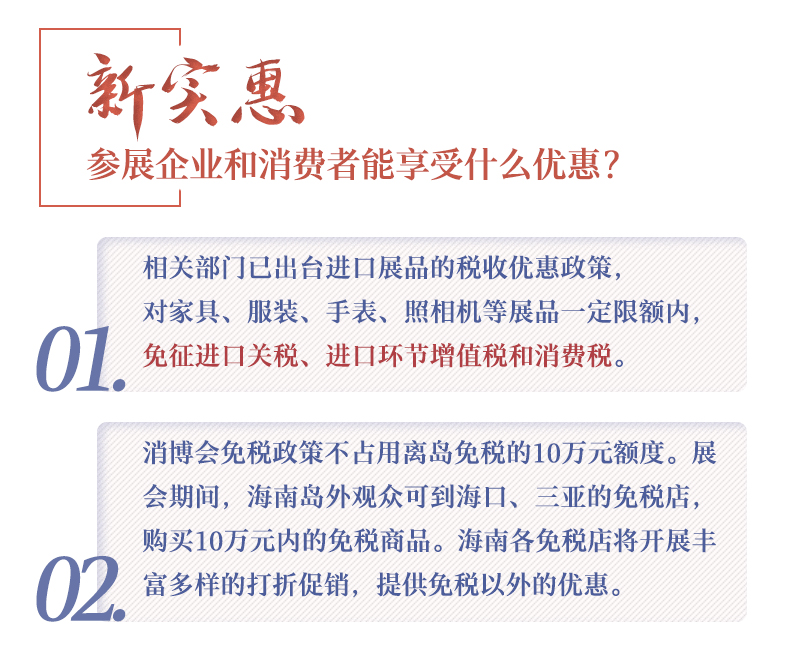 ??? 除了空前的展覽規模,本屆消博會還為參展企業和消費者提供稅收優惠政策:家具、服裝、手表、照相機等展品一定限額內,免征進口關稅、進口環節增值稅和消費稅,并且消博會提供的免稅政策不占用離島免稅的10萬元額度。