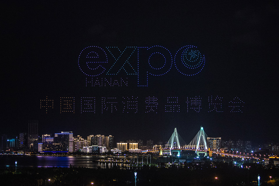 ??? 首屆中國國際消費品博覽會于5月7日至10日在位于海口的海南國際會展中心舉辦。5月6日晚,海口市上演無人機表演秀,迎接首屆消博會的舉辦。新華社記者 蒲曉旭 攝