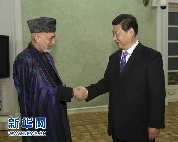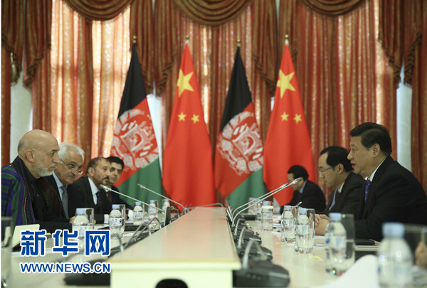 ????習近平指出,2014年之后,阿富汗的命運將更加緊密地同地區國家聯系在一起。中方支持阿富汗融入地區經濟合作。中方將于8月舉辦阿富汗問題伊斯坦布爾進程第四次外長會,我們愿同阿方密切合作,辦好這次會議。中方也愿推動上海合作組織在阿富汗問題上發揮更大作用。