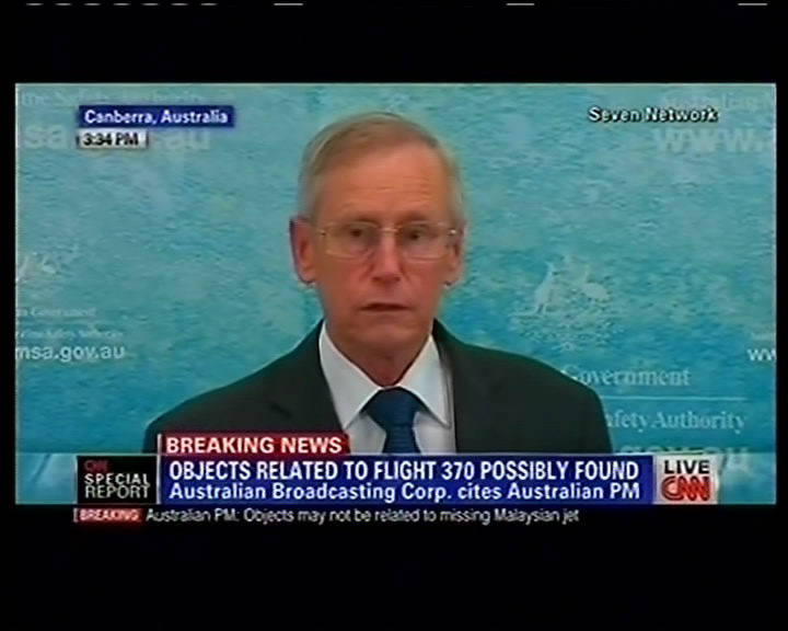 ??? 澳方稱在印度洋中發(fā)現(xiàn)了可能與馬航失聯(lián)客機(jī)有關(guān)物體這張3月20日拍攝的CNN視頻截圖顯示,澳大利亞海事安全局官員在堪培拉召開(kāi)的新聞發(fā)布會(huì)上發(fā)言(左圖為相關(guān)搜尋海域的示意圖)。澳大利亞總理阿博特當(dāng)日在議會(huì)說(shuō),澳方在印度洋中發(fā)現(xiàn)了可能與馬航失聯(lián)客機(jī)有關(guān)的兩個(gè)物體。澳大利亞海事安全局官員當(dāng)日說(shuō),發(fā)現(xiàn)可疑碎片的位置與之前確定的馬航失聯(lián)客機(jī)南部搜尋航道高度吻合,但當(dāng)?shù)睾S蛩沫h(huán)境非常差。新華社發(fā)