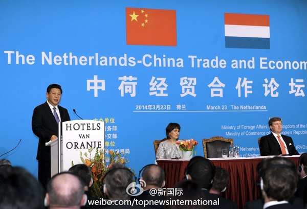 ????新華網(wǎng)北京3月24日電 據(jù)新華社“新國(guó)際”微博報(bào)道, 習(xí)近平主席出席中荷經(jīng)貿(mào)合作論壇開幕式,暢談豐碩合作成果。他還說(shuō):“荷蘭足球隊(duì)被稱為世界足球的‘無(wú)冕之王’。荷蘭是‘歐洲菜籃子’和‘郁金香王國(guó)’。”習(xí)近平這番話博得滿場(chǎng)掌聲和笑聲。