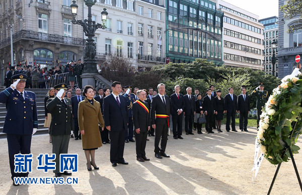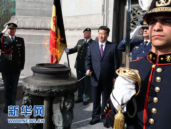 3月30日,國家主席習(xí)近平在布魯塞爾向比利時(shí)無名戰(zhàn)士墓獻(xiàn)花圈。 新華社記者 龐興雷 攝