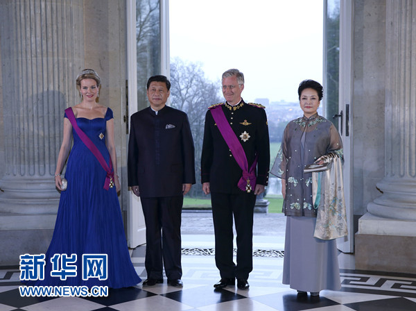 ????當晚,比利時國王菲利普在拉肯宮舉行隆重國宴歡迎習近平到訪。拉肯宮內,燈火輝煌,鮮花綻放。習近平和夫人彭麗媛抵達時,受到菲利普國王和瑪蒂爾德王后熱情迎接。兩國元首夫婦一同步入宴會大廳。奏中比兩國國歌。