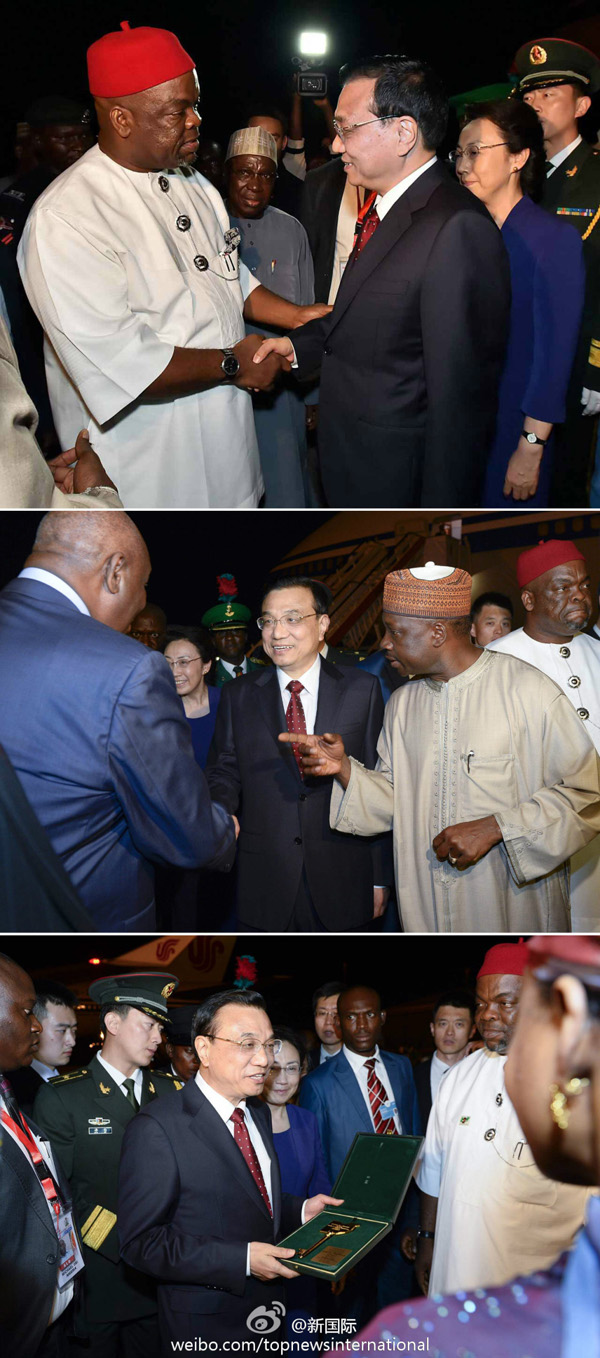 新華網(wǎng)北京5月7日電? 據(jù)新華社“新國(guó)際”微博報(bào)道,國(guó)務(wù)院總理李克強(qiáng)6日晚抵達(dá)阿布賈,開始對(duì)尼日利亞進(jìn)行正式訪問(wèn)并出席第24屆世界經(jīng)濟(jì)論壇非洲峰會(huì)全會(huì)。夫人程虹同機(jī)抵達(dá)。尼外交部長(zhǎng)、勞工部長(zhǎng)到機(jī)場(chǎng)迎接,聯(lián)邦首都區(qū)部長(zhǎng)按照接待尊貴客人的傳統(tǒng)禮儀,向李克強(qiáng)贈(zèng)送了阿布賈城市鑰匙,熱烈歡迎中國(guó)總理到訪。
