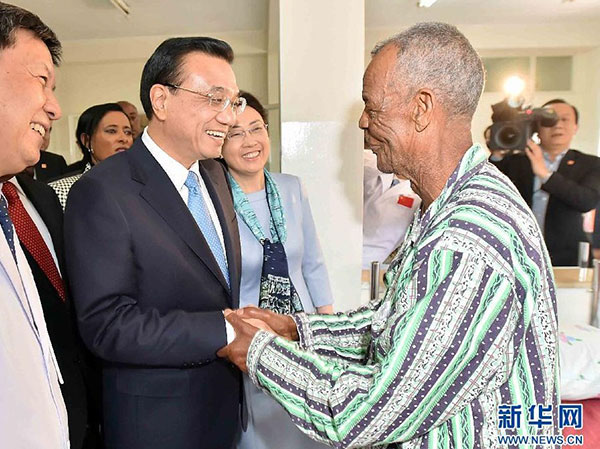 ??? 5月6日,中國國務院總理李克強與埃塞俄比亞總統穆拉圖一同來到亞的斯亞貝巴阿勒塔醫院,看望受益于中國免費白內障手術“光明行”活動的埃塞俄比亞患者。新華社記者李濤攝