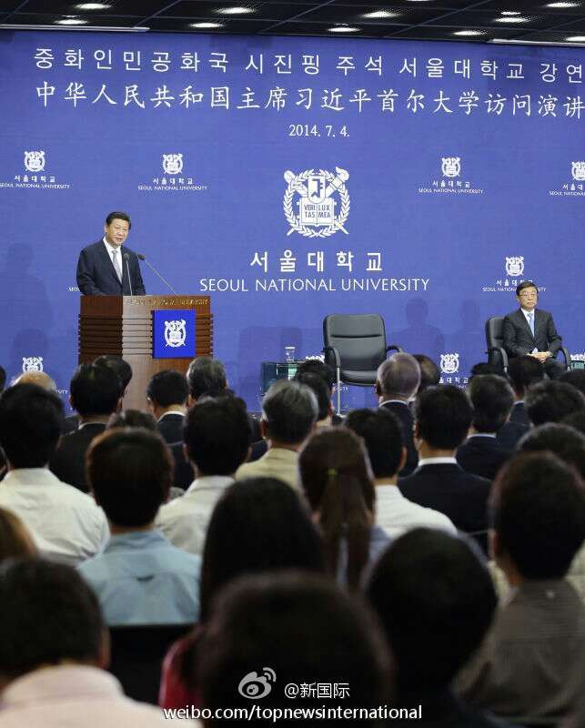 ??? 新華網(wǎng)北京7月4日電 據(jù)新華社“新國際”微博報(bào)道,首爾大學(xué)的大講堂座無虛席,傾聽中國,感受中韓夢想的交匯。習(xí)主席說,要有海納百川的胸懷,以開放包容心態(tài)虛心傾聽世界的聲音。中國將繼續(xù)向世界學(xué)習(xí)、向各國人民學(xué)習(xí),學(xué)習(xí)人類創(chuàng)造的一切文明成果,推動中國和世界發(fā)展得更好。?
