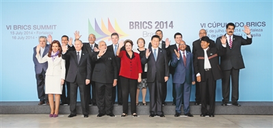 本報巴西利亞7月16日電 (記者杜尚澤、丁剛)7月16日,金磚國家同南美國家領(lǐng)導(dǎo)人對話會在巴西利亞舉行。中國國家主席習(xí)近平、巴西總統(tǒng)羅塞夫、俄羅斯總統(tǒng)普京、印度總理莫迪、南非總統(tǒng)祖馬以及蘇里南總統(tǒng)鮑特塞、阿根廷總統(tǒng)克里斯蒂娜、玻利維亞總統(tǒng)莫拉萊斯、哥倫比亞總統(tǒng)桑托斯、智利總統(tǒng)巴切萊特、厄瓜多爾總統(tǒng)科雷亞、圭亞那總統(tǒng)拉莫塔爾、巴拉圭總統(tǒng)卡特斯、秘魯總統(tǒng)烏馬拉、烏拉圭總統(tǒng)穆希卡、委內(nèi)瑞拉總統(tǒng)馬杜羅等南美國家領(lǐng)導(dǎo)人共同出席。