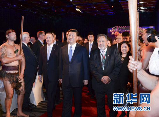 ????習近平和夫人彭麗媛抵達時,新西蘭總理約翰·基夫婦迎接,毛利族代表以傳統方式歡迎。在毛利族勇士和中國舞龍引領下,習近平和彭麗媛步入大廳,全場起立鼓掌。毛利族青年用歌聲表達喜悅和友誼。