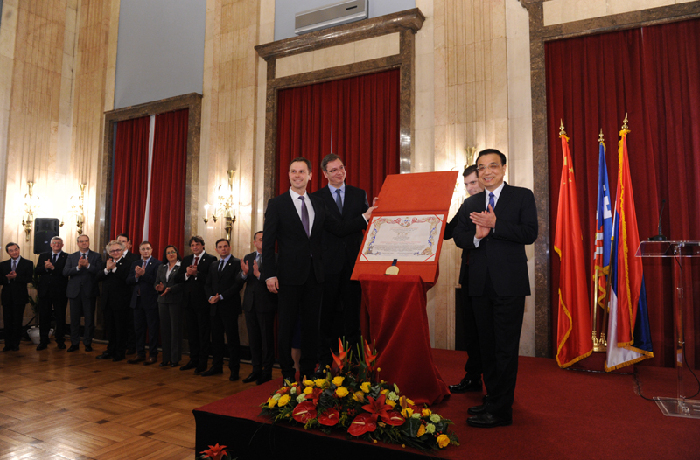 李克強被授予貝爾格萊德榮譽市民。新華社 饒愛民 攝