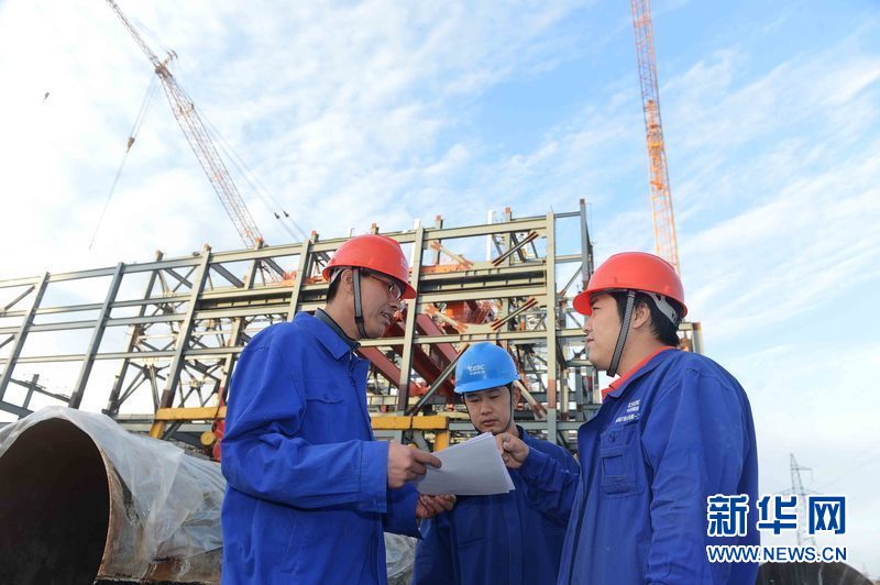????烏茲別克斯坦安格連(市)電廠主廠房鋼結構施工,項目經理兼項目黨支部書記楚相華(左)在與現場技術人員一起探討工程進度等情況。新華網發(fā) 記者沙達提 攝