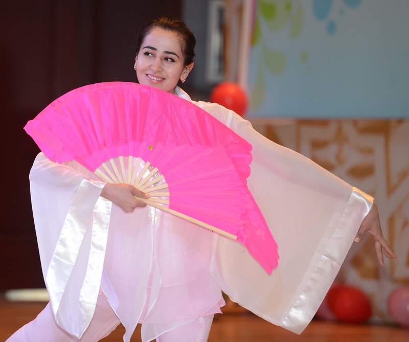 4月28日,在烏內務部文化宮禮堂活動現場,撒馬爾罕外國語學院的UGILOY(中文名:雅靜)在參加比賽。新華網記者 沙達提攝