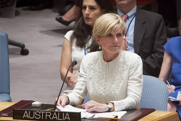 ↑2015年7月29日,在位于美國紐約的聯合國總部,澳大利亞外交部長畢曉普(前)在安理會上發言。
