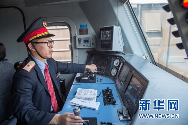 10月15日,第1000列中歐班列開(kāi)行前,重慶機(jī)務(wù)段執(zhí)行本次班列駕駛?cè)蝿?wù)的司機(jī)王銘杰在駕駛室內(nèi)進(jìn)行開(kāi)行前的操作。當(dāng)日11時(shí)45分,載著筆記本電腦等51個(gè)集裝箱貨物的中歐班列,緩緩駛出重慶團(tuán)結(jié)村站,駛向1.1萬(wàn)公里之外的德國(guó)杜伊斯堡。這是第1000列往來(lái)中國(guó)和歐洲之間的國(guó)際貨運(yùn)列車。新華社記者劉潺攝