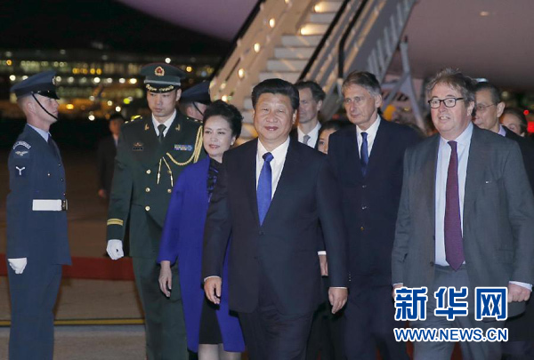 當(dāng)?shù)貢r(shí)間晚8時(shí)許,習(xí)近平乘坐的專機(jī)抵達(dá)倫敦希思羅機(jī)場。習(xí)近平和夫人彭麗媛在機(jī)場受到英國女王代表胡德子爵、外交大臣哈蒙德等熱情迎接。英國青年向習(xí)近平夫婦獻(xiàn)上鮮花。
