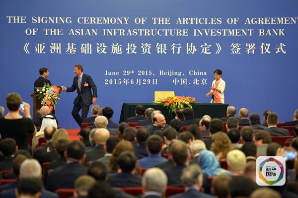 ????2015年6月29日,《亞洲基礎設施投資銀行協定》簽署儀式在北京舉行。當日,英國授權代表(臺上中)在簽署《協定》后與儀式主持、財政部副部長史耀斌握手。