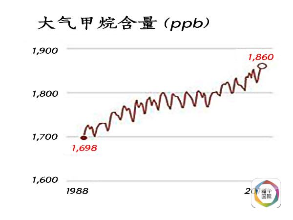 美國(guó)國(guó)家海洋和大氣管理局統(tǒng)計(jì),2014年大氣中甲烷的含量是工業(yè)革命前的2.5倍強(qiáng)。