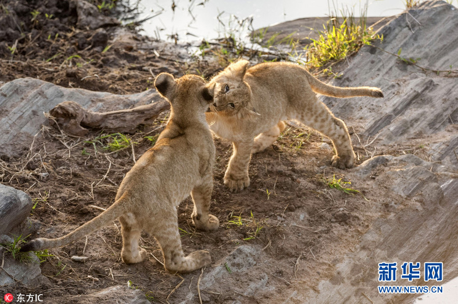 1月2日報道(具體拍攝時間不詳),肯尼亞馬賽馬拉國家保護(hù)區(qū),64歲的攝影師Ingo Gelach在當(dāng)?shù)嘏臄z到一組有趣又暖心的照片。畫面中,兩頭小獅子站在水邊,似乎正考慮跨越面前的水域。其中一頭獅子用前腳搭在同伴的肩膀上,似乎在表達(dá)友好,又似是在鼓勵同伴不要害怕,勇敢地跨過去。(圖片來源:東方IC)