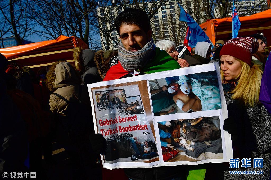 當?shù)貢r間2018年3月3日,德國柏林,當?shù)孛癖娕e行游行,抗議土耳其對敘利亞阿夫林地區(qū)的庫爾德人采取軍事行動。(圖片來源:視覺中國)