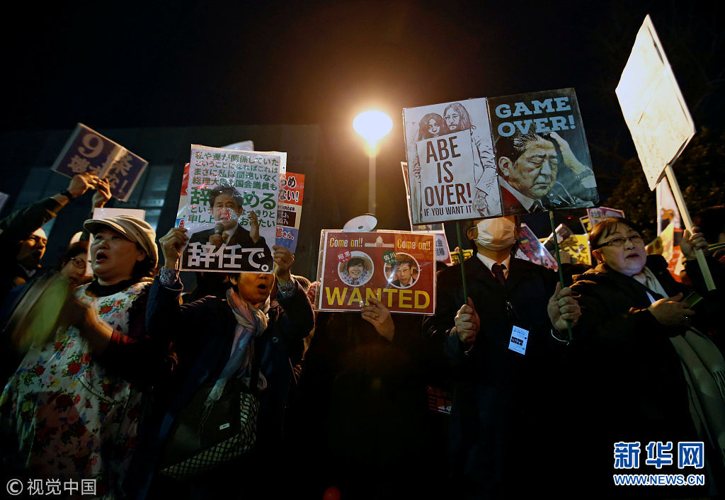3月12日,日本東京,日本民眾在首相府邸前游行抗議。安倍晉三此前就森友學園丑聞事件的文件被篡改一事道歉。(圖片來源:視覺中國)