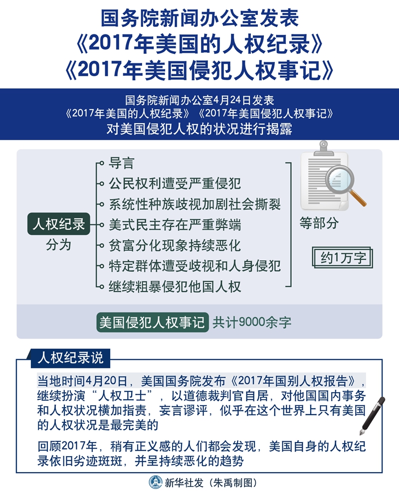 圖表:國務院新聞辦公室發表《2017年美國的人權紀錄》《2017年美國侵犯人權事記》 新華社發朱禹 制圖