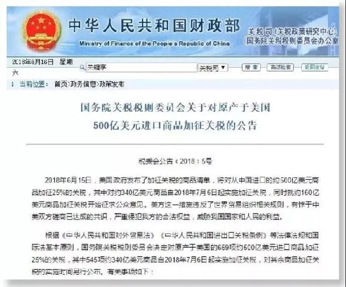 今天凌晨(16日),中國國務院關稅稅則委員會發布公告決定,對原產于美國的659項約500億美元進口商品加征25%的關稅。委員會辦公室有關負責人還表示,中方注意到,美方發表聲明稱,如果中國采取報復性措施,美國將繼續追加額外關稅。對此,中國將保留采取相應措施的權利。