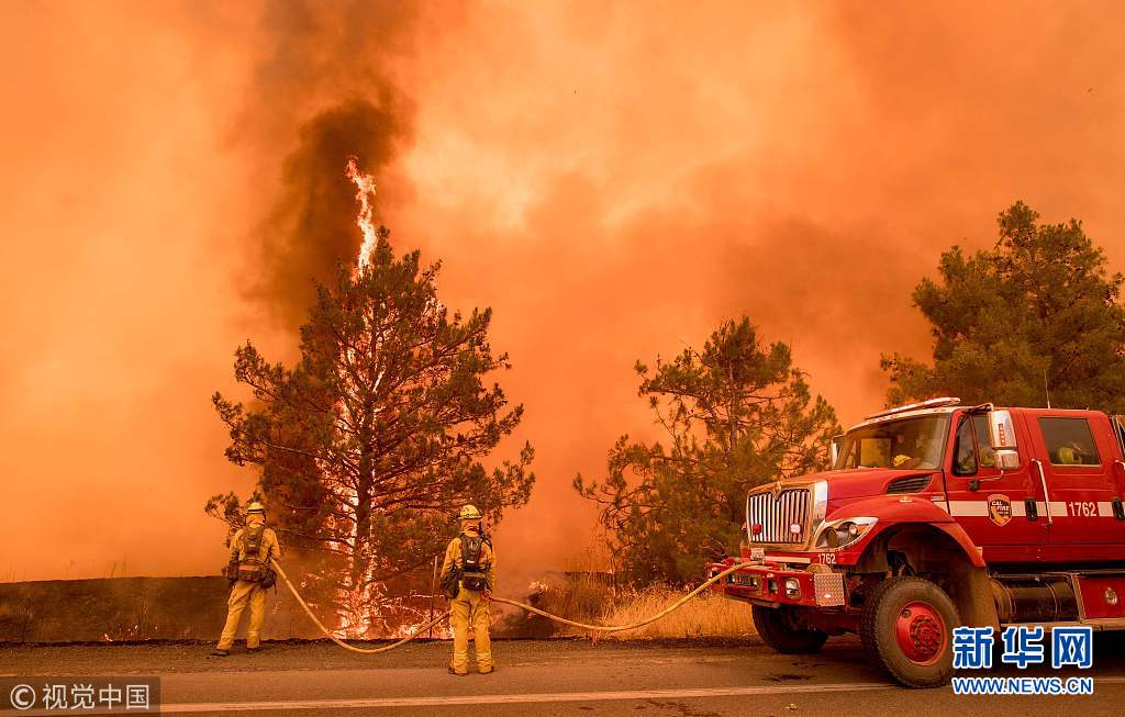 當地時間2018年7月1日,美國加州克利爾萊克奧克斯,加州萊克縣“波尼”(Pawnee)大火持續蔓延,現場烈火熊熊,過火面積達3000英畝(約合12150公頃)。(圖片來源:視覺中國)