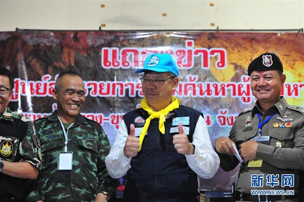 7月10日,在泰國清萊,清萊府府尹那榮薩(右二)在新聞發布會上慶祝救援成功。新華社發(拉亨 攝)