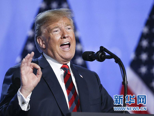 7月12日,在比利時布魯塞爾的北約總部,美國總統特朗普召開新聞發布會。新華社記者 葉平凡 攝