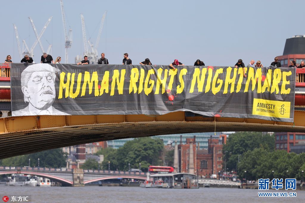 7月12日,英國倫敦,國際特赦組織成員在倫敦泰晤士河上沃克斯豪爾橋懸掛橫幅,抗議美國總統特朗普到訪英國。(圖片來源:東方IC)