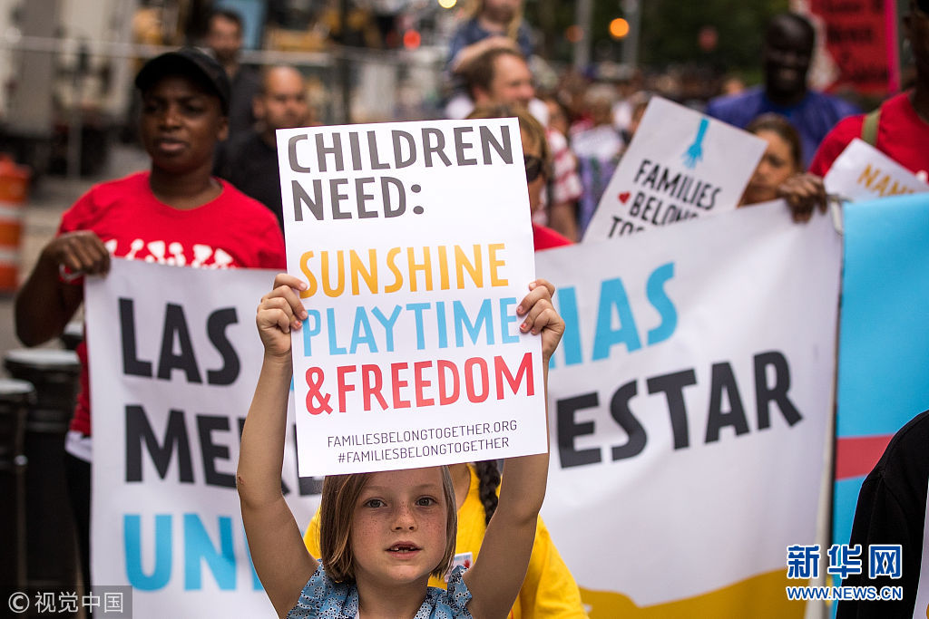 當地時間2018年7月18日,美國紐約,包括托兒所從業人員、父母及其子女在內的社會各界人士在美國移民和海關執法局(ICE)附近組織示威游行,抗議特朗普政府近期在美國南部邊境實施針對非法移民家庭的強制拘留和家庭成員離散政策。 當天,共和黨領導的眾議院通過了支持ICE的決議,并譴責一些民主黨人和進步積極分子要求廢除ICE的呼聲。(圖片來源:視覺中國)