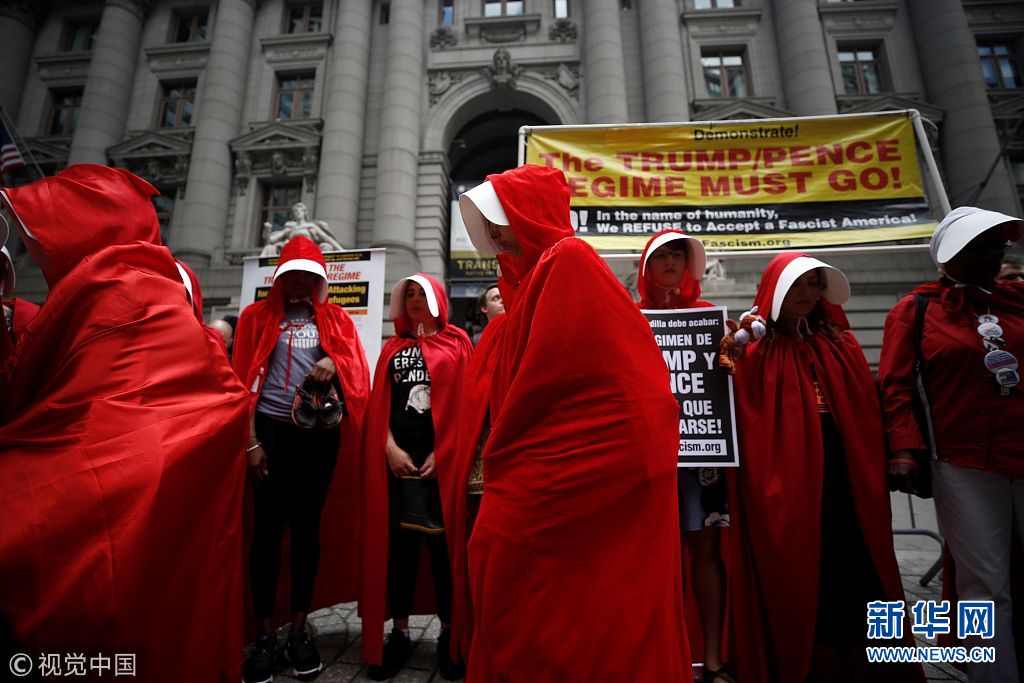 當地時間2018年7月31日,美國紐約,女性示威者扮成美劇《使女的故事》中的“使女”在亞歷山大·漢密爾頓海關大樓前示威,抗議美國總統特朗普和副總統麥克·彭斯。她們手持鞋子,代表被迫與父母分離的移民兒童。(圖片來源:視覺中國)