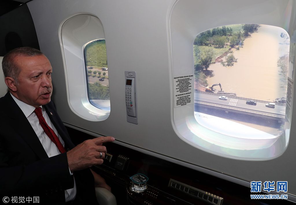 當地時間2018年8月11日,土耳其奧爾杜,土耳其總統埃爾多安乘直升機視察洪災區。(圖片來源:視覺中國)