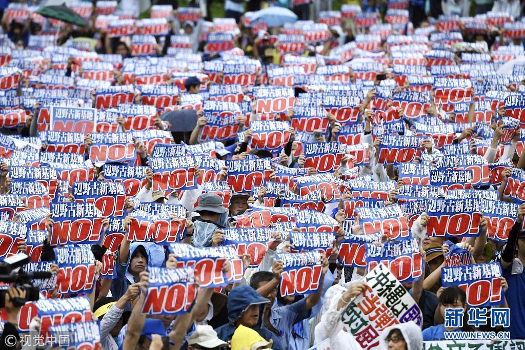 當地時間2018年8月11日,日本沖繩縣約7萬民眾8月11日在那霸市舉行大規模集會,反對駐日美軍將普天間基地遷往名護市邊野古地區,要求駐日美軍放棄在邊野古地區新建基地并立即關閉普天間機場。當天,日本東京都、大阪府、福岡、北海道縣等地民眾也同時舉行集會和游行,抗議日本政府推進邊野古地區填海施工。 (圖片來源:視覺中國)