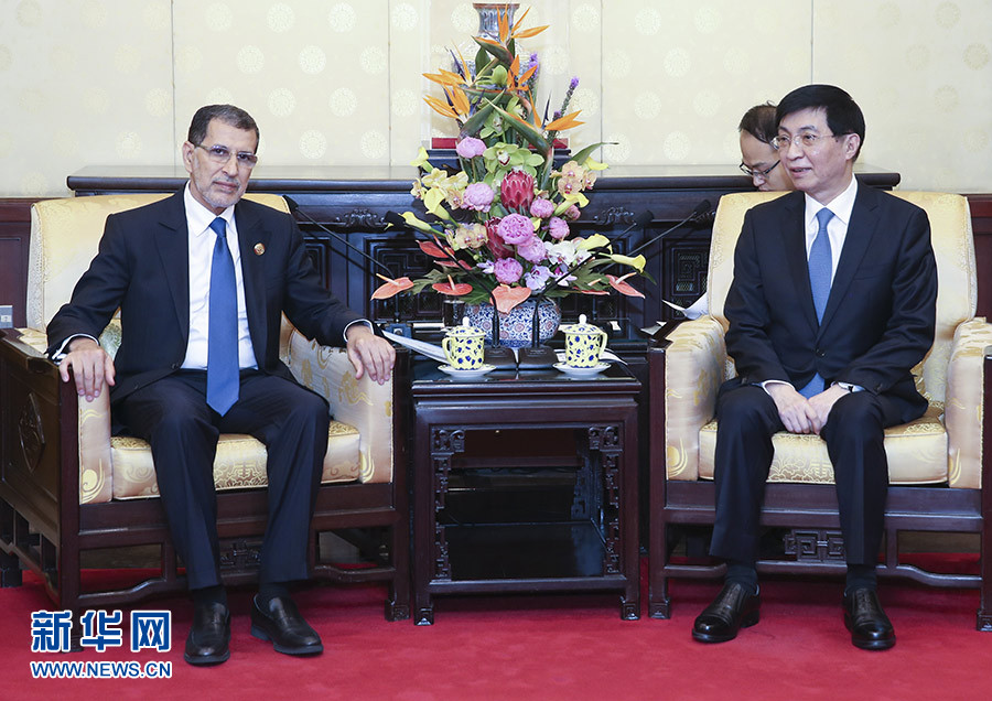 9月4日,中共中央政治局常委、中央書記處書記王滬寧在北京釣魚臺國賓館會見摩洛哥首相奧斯曼尼。 新華社記者 姚大偉 攝